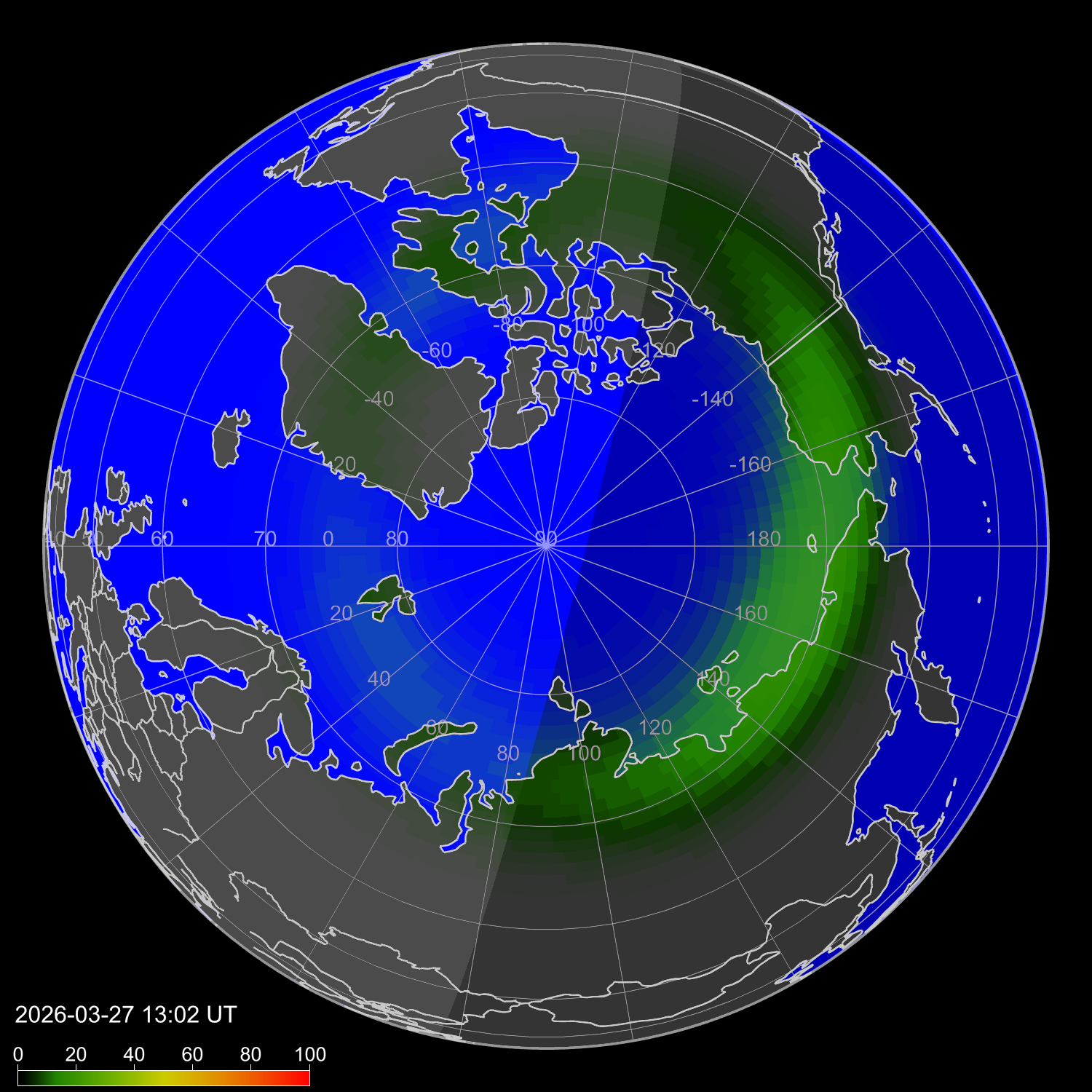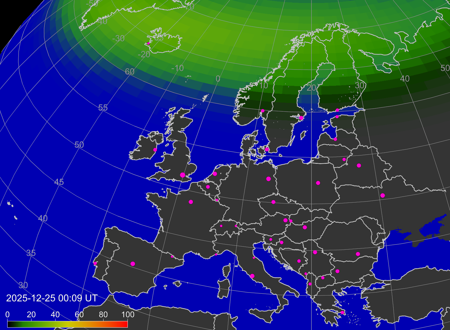 Индекс интенсивности полярных сияний и теоретически возможная широта наблюдений для ночного времени в восточном полушарии