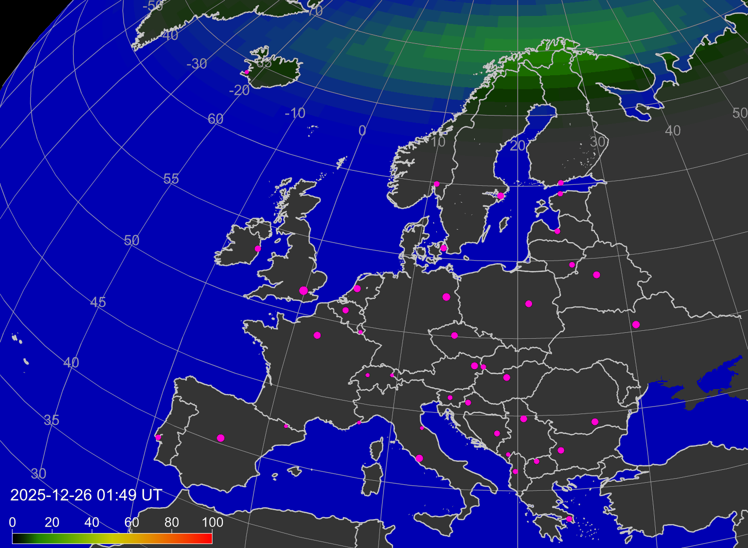Изменения и часовой прогноз индекса интенсивности полярных сияний с 2025-12-25 по 2025-12-26
