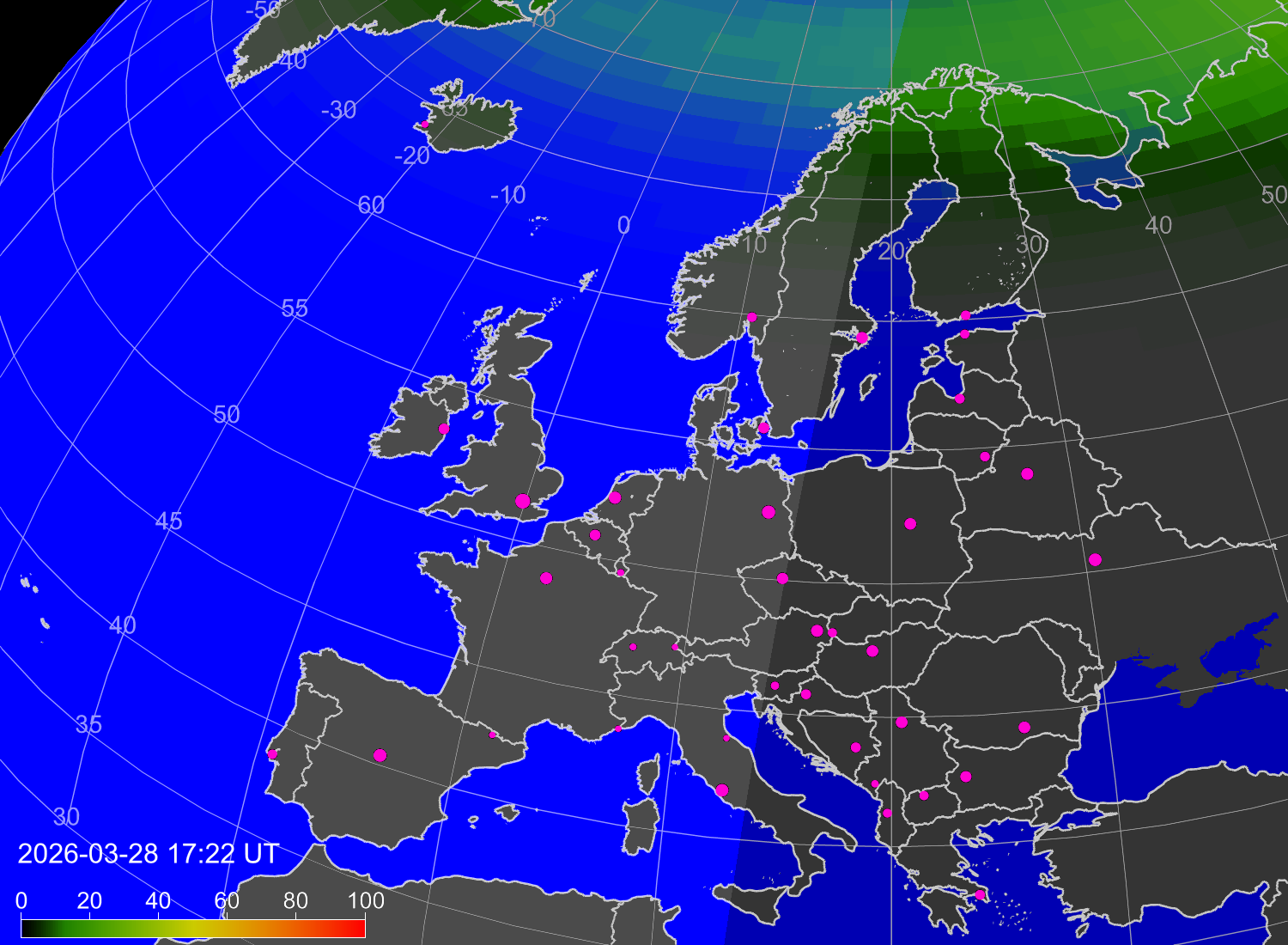 Вероятность полярных сияний в городах Европы