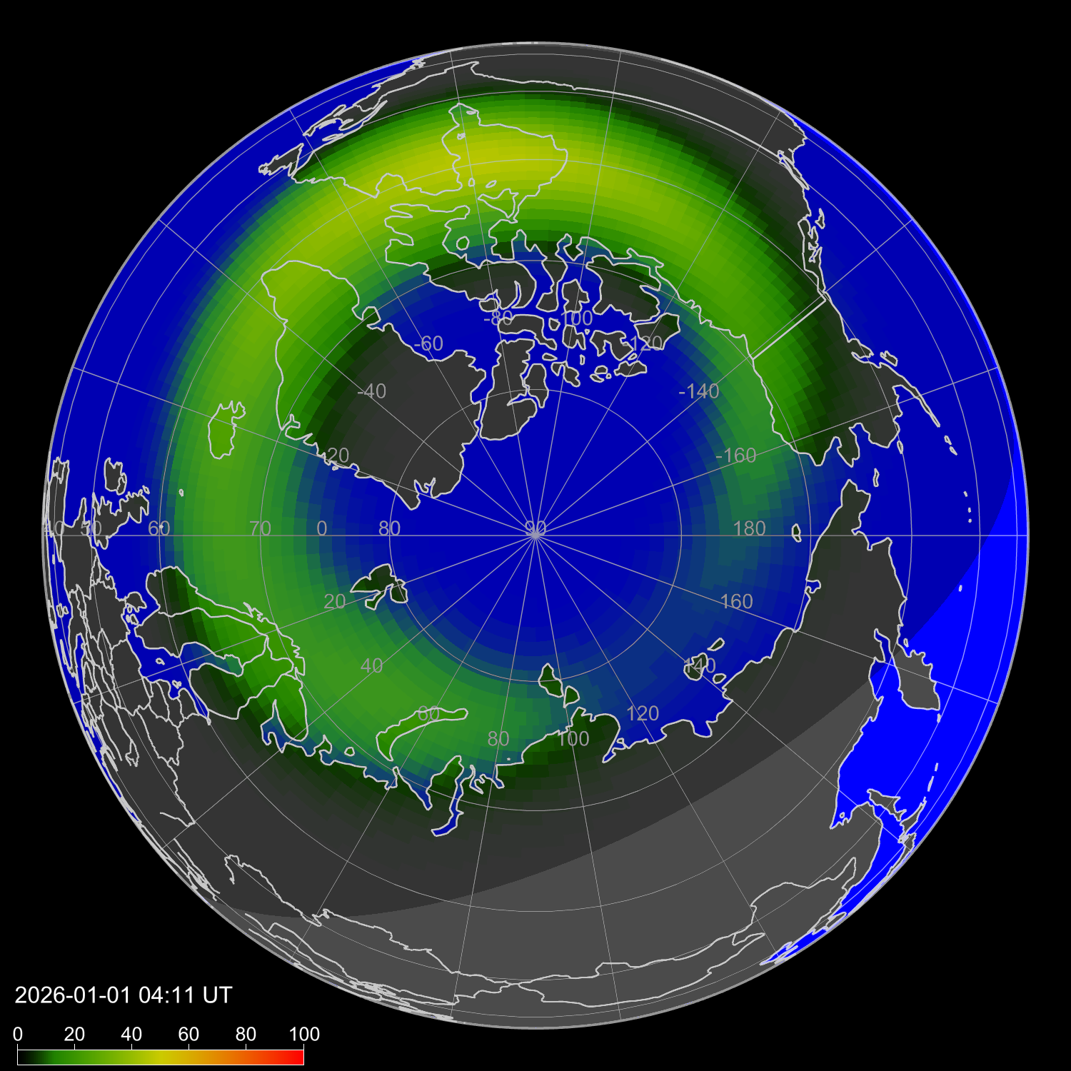 Изменения и часовой прогноз индекса интенсивности полярных сияний с 2025-12-31 по 2026-01-01