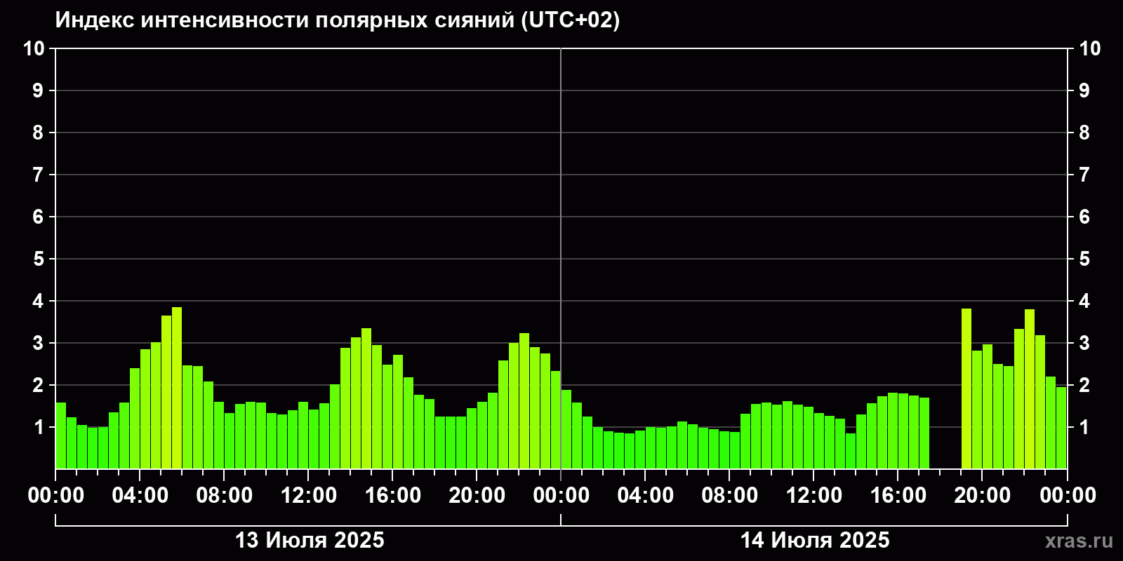 Изменения индекса интенсивности полярных сияний с 2025-07-13 по 2025-07-14 по местному времени