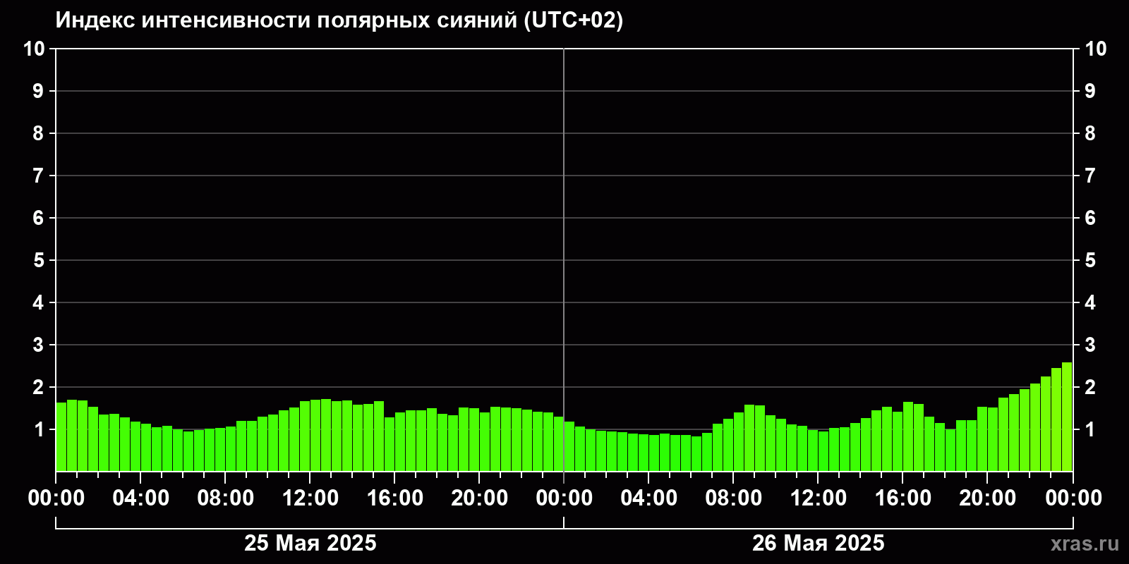 Изменения индекса интенсивности полярных сияний с 2025-05-25 по 2025-05-26 по местному времени