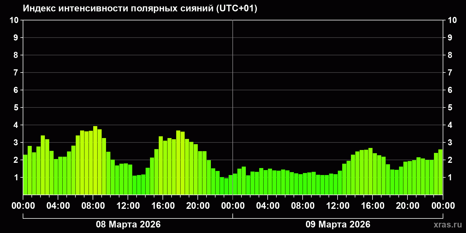 Изменения индекса интенсивности полярных сияний с 2026-03-08 по 2026-03-09 по местному времени