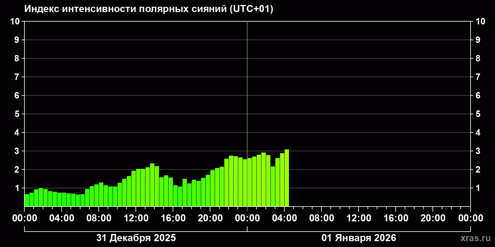Изменения индекса интенсивности полярных сияний с 2025-12-31 по 2026-01-01 по местному времени