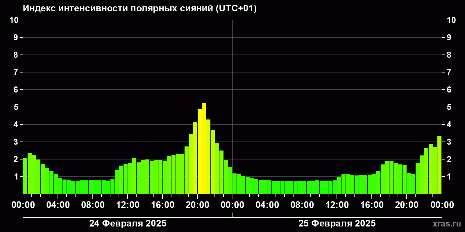 Изменения индекса интенсивности полярных сияний с 2025-02-24 по 2025-02-25 по местному времени