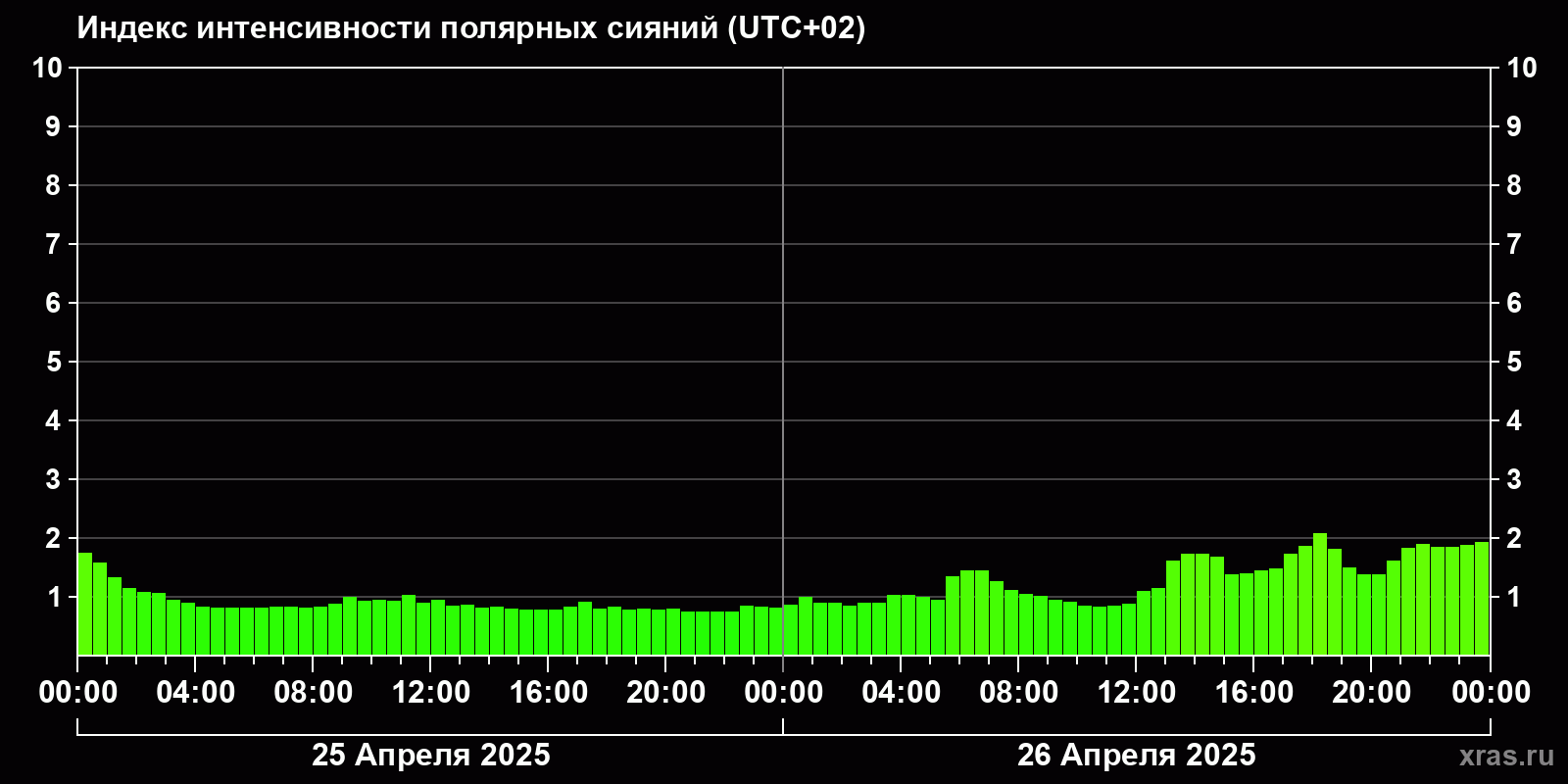 Изменения индекса интенсивности полярных сияний с 2025-04-25 по 2025-04-26 по местному времени