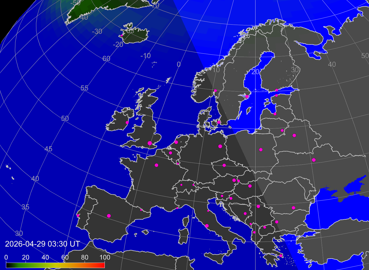 Индекс интенсивности полярных сияний и теоретически возможная широта наблюдений для ночного времени в восточном полушарии