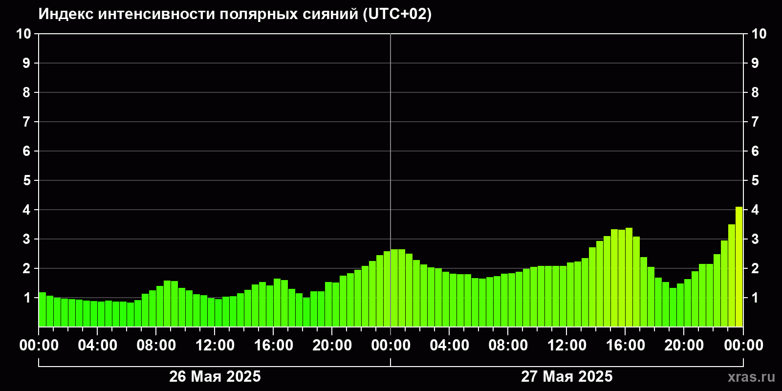 Изменения индекса интенсивности полярных сияний с 2025-05-26 по 2025-05-27 по местному времени
