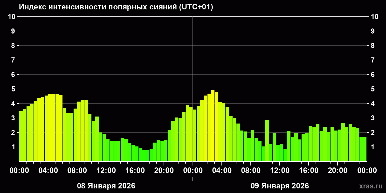 Изменения индекса интенсивности полярных сияний с 2026-01-08 по 2026-01-09 по местному времени