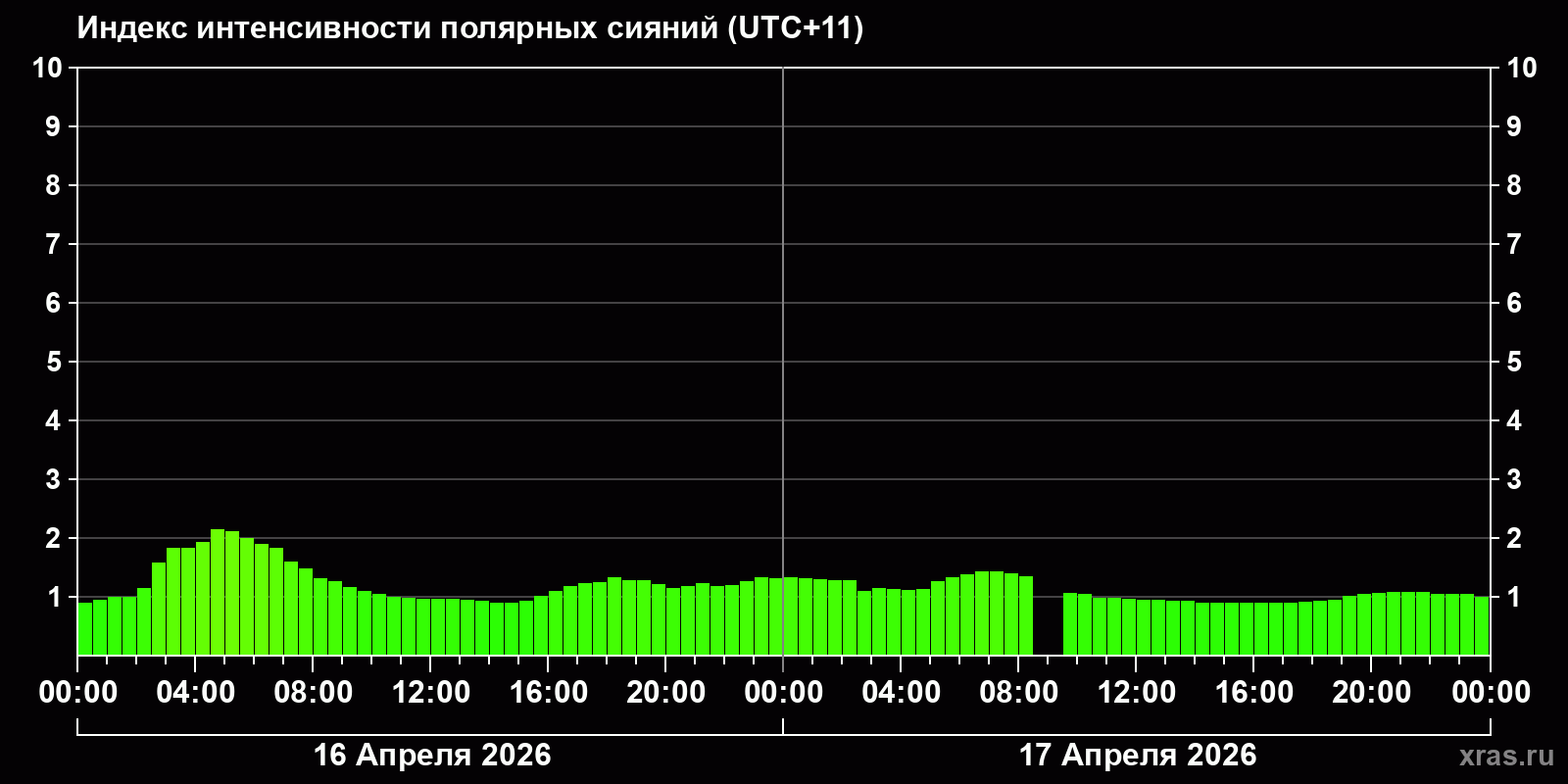 Изменения индекса интенсивности полярных сияний с 2026-04-16 по 2026-04-17 по местному времени