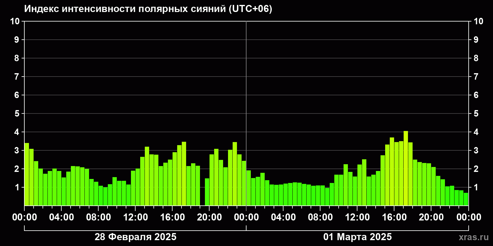 Изменения индекса интенсивности полярных сияний с 2025-02-28 по 2025-03-01 по местному времени
