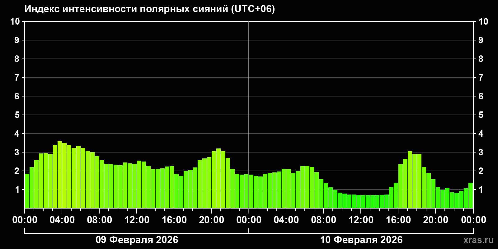 Изменения индекса интенсивности полярных сияний с 2026-02-09 по 2026-02-10 по местному времени