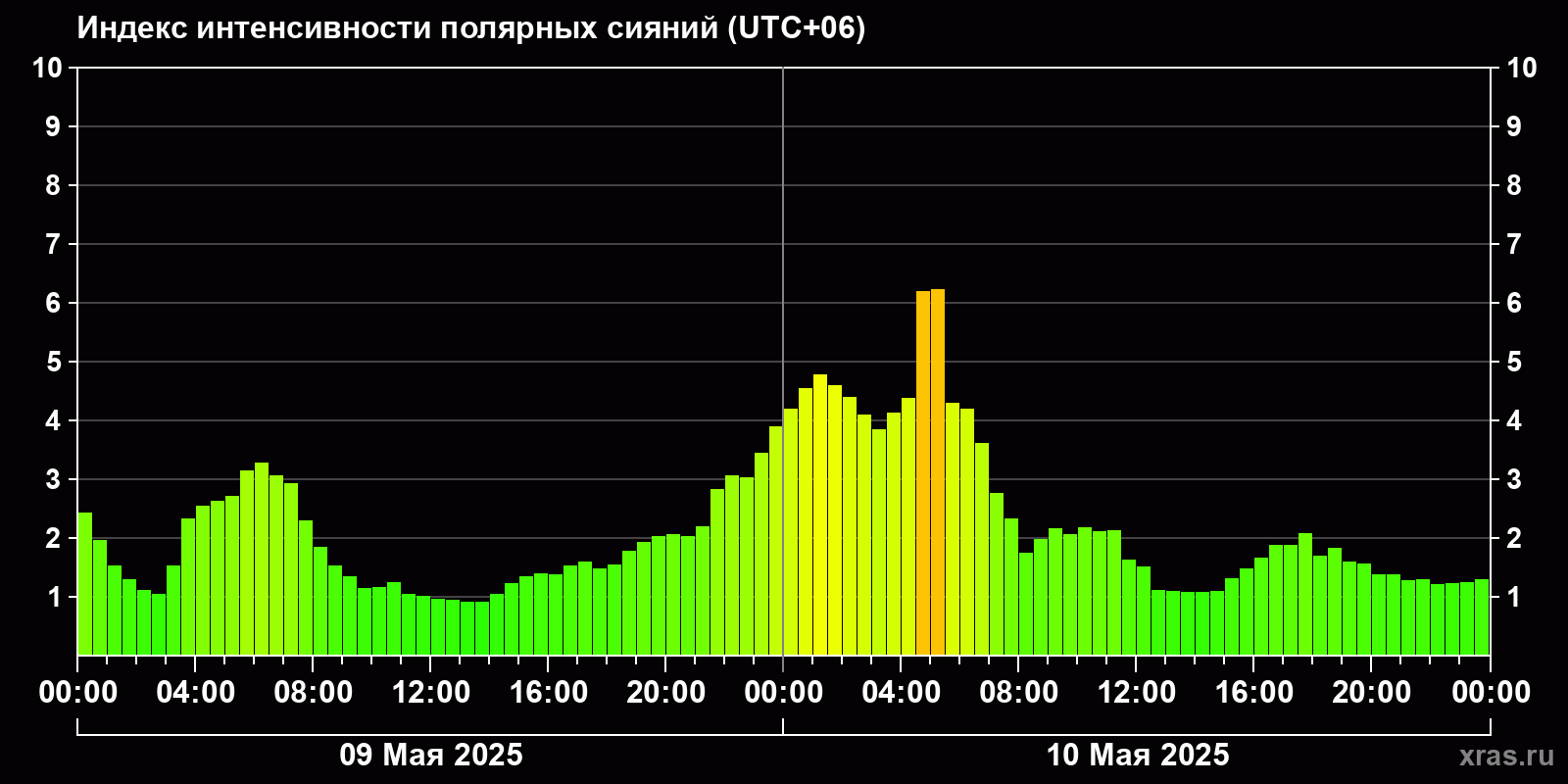 Изменения индекса интенсивности полярных сияний с 2025-05-09 по 2025-05-10 по местному времени