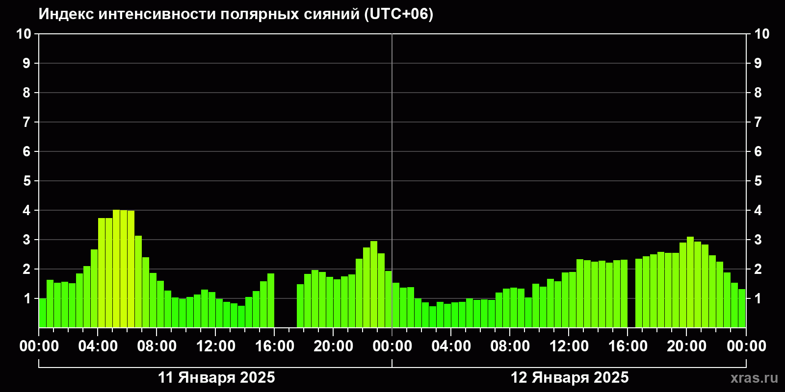 Изменения индекса интенсивности полярных сияний с 2025-01-11 по 2025-01-12 по местному времени