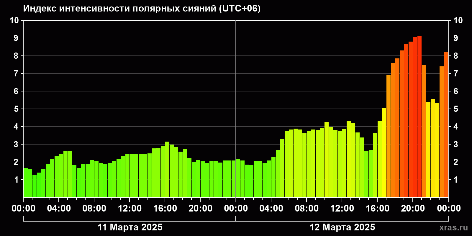 Изменения индекса интенсивности полярных сияний с 2025-03-11 по 2025-03-12 по местному времени