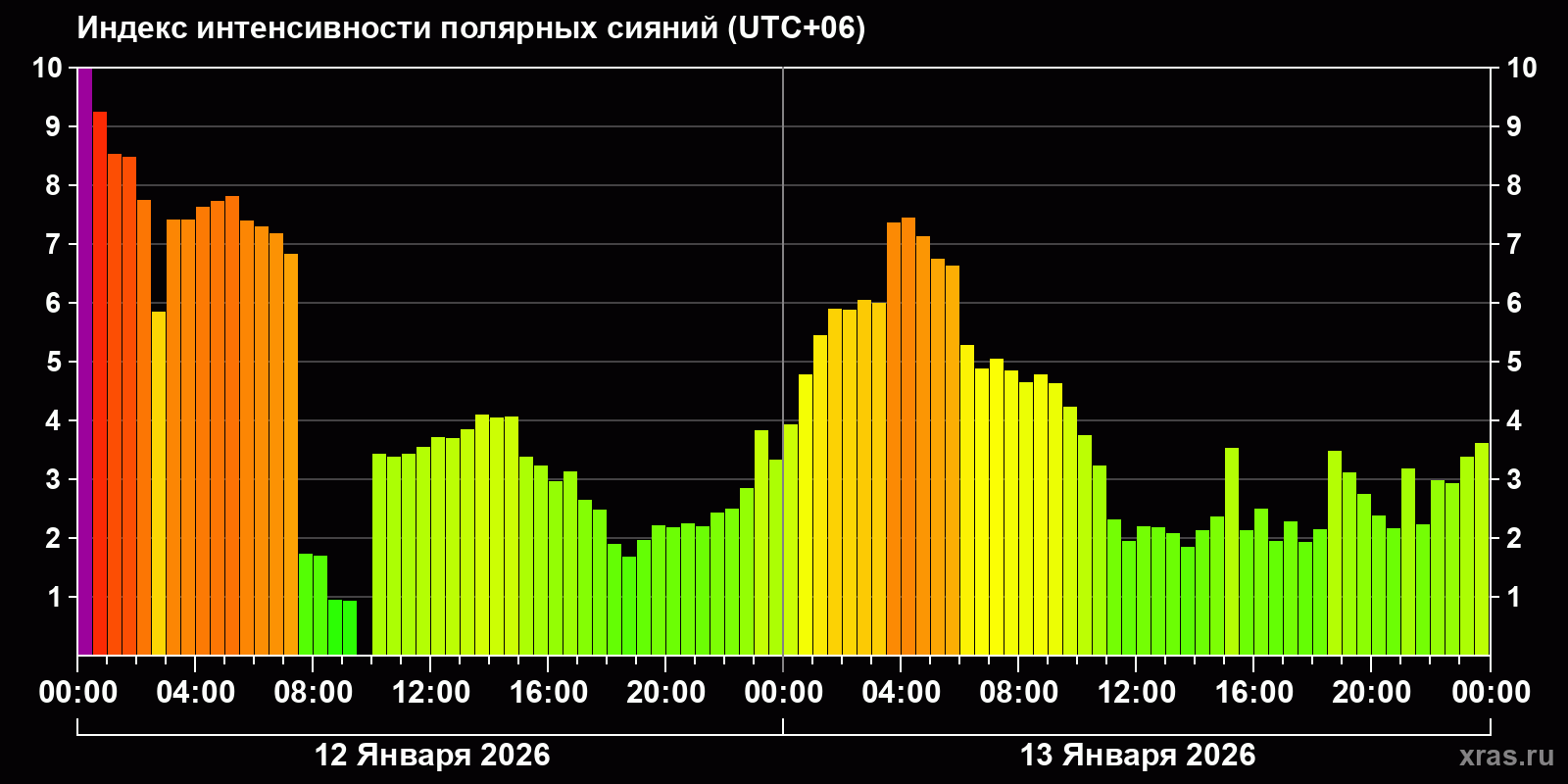 Изменения индекса интенсивности полярных сияний с 2026-01-12 по 2026-01-13 по местному времени