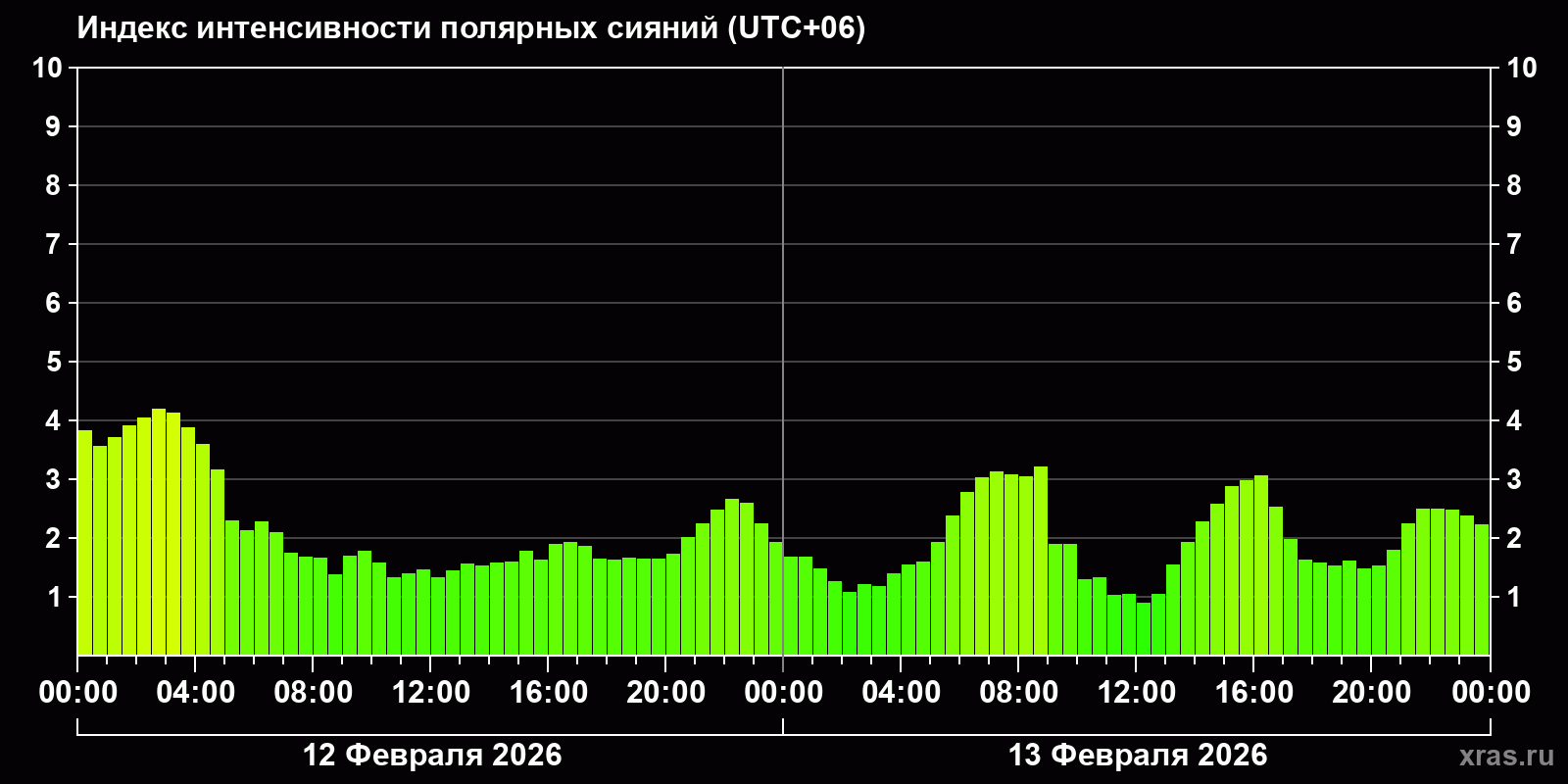 Изменения индекса интенсивности полярных сияний с 2026-02-12 по 2026-02-13 по местному времени
