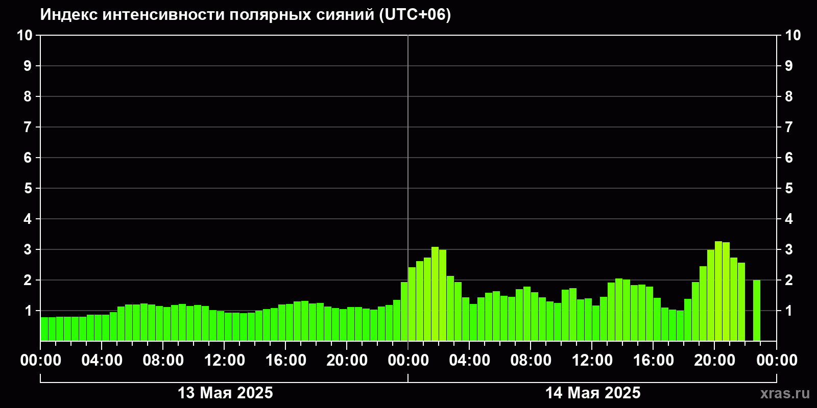 Изменения индекса интенсивности полярных сияний с 2025-05-13 по 2025-05-14 по местному времени