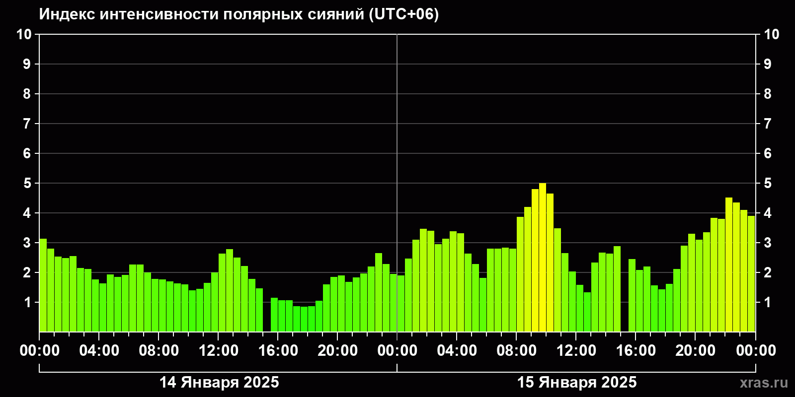 Изменения индекса интенсивности полярных сияний с 2025-01-14 по 2025-01-15 по местному времени