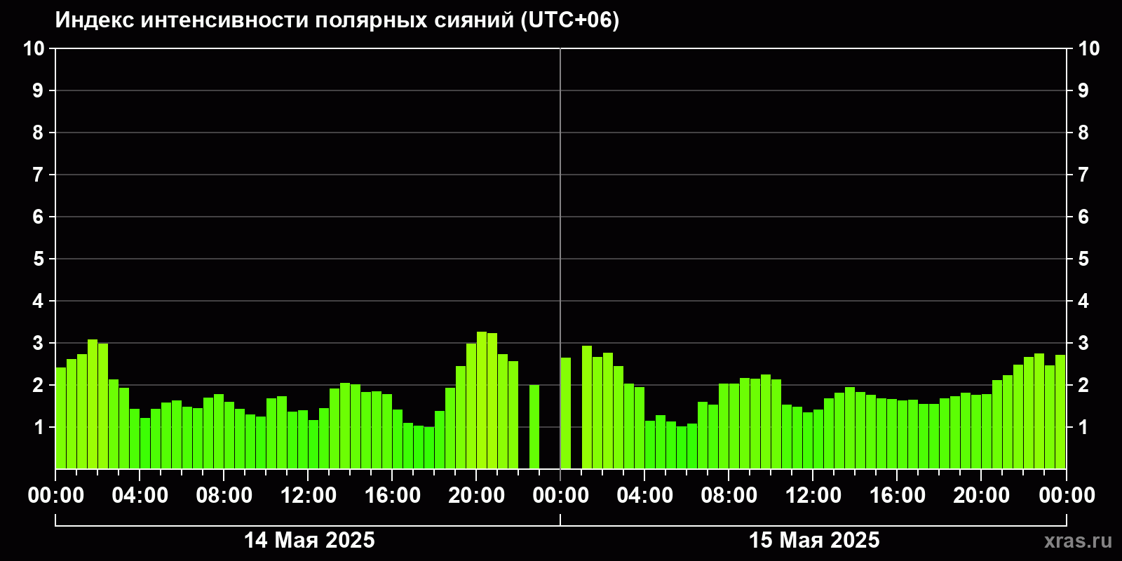 Изменения индекса интенсивности полярных сияний с 2025-05-14 по 2025-05-15 по местному времени