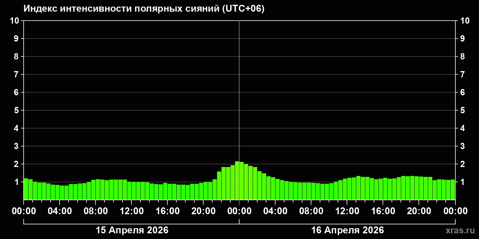 Изменения индекса интенсивности полярных сияний с 2026-04-15 по 2026-04-16 по местному времени