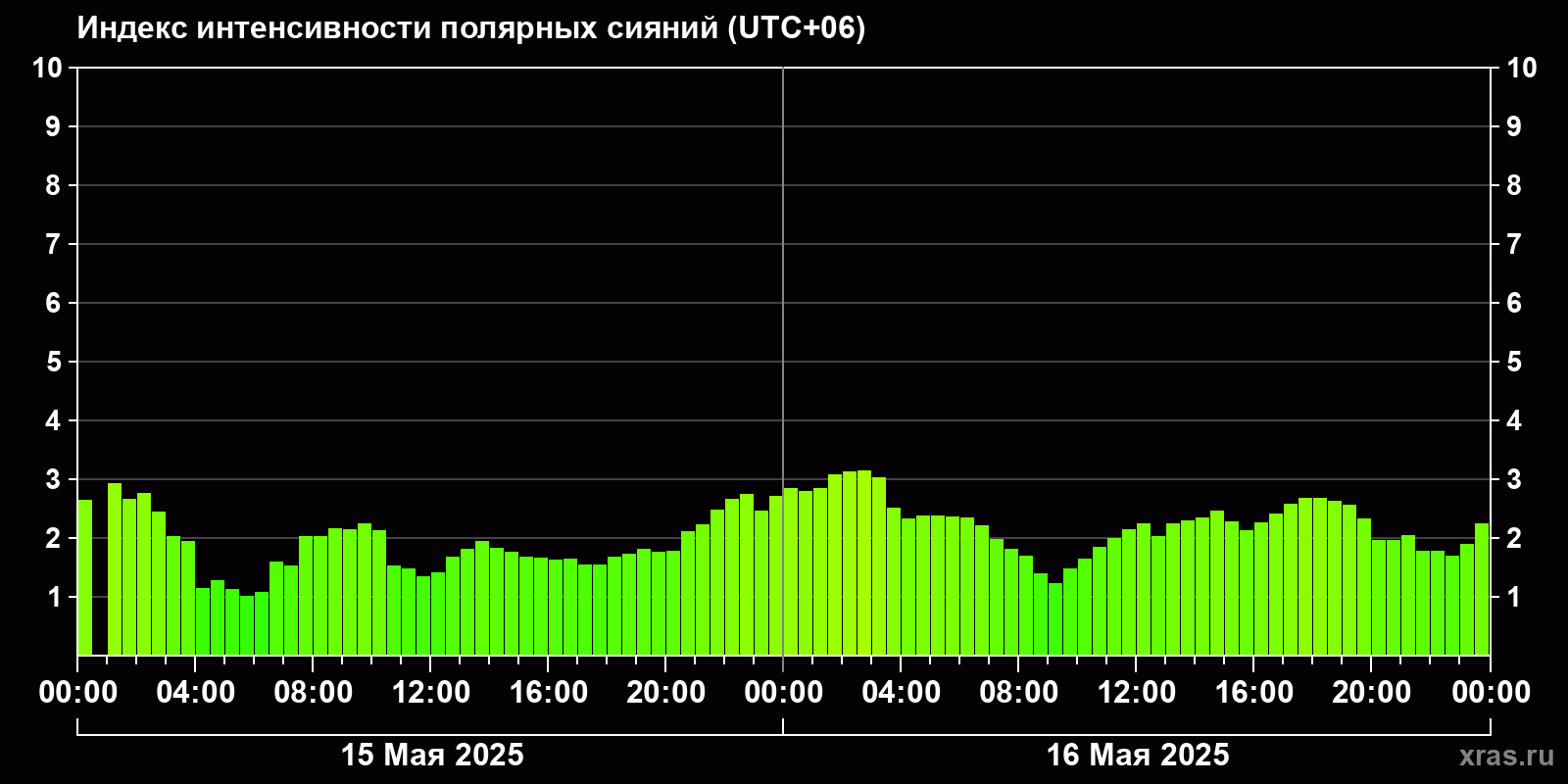 Изменения индекса интенсивности полярных сияний с 2025-05-15 по 2025-05-16 по местному времени