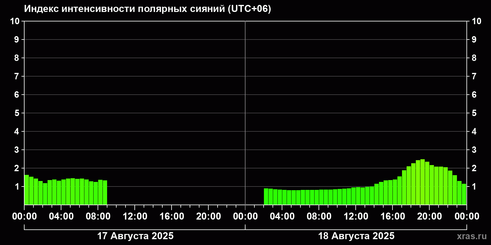 Изменения индекса интенсивности полярных сияний с 2025-08-17 по 2025-08-18 по местному времени