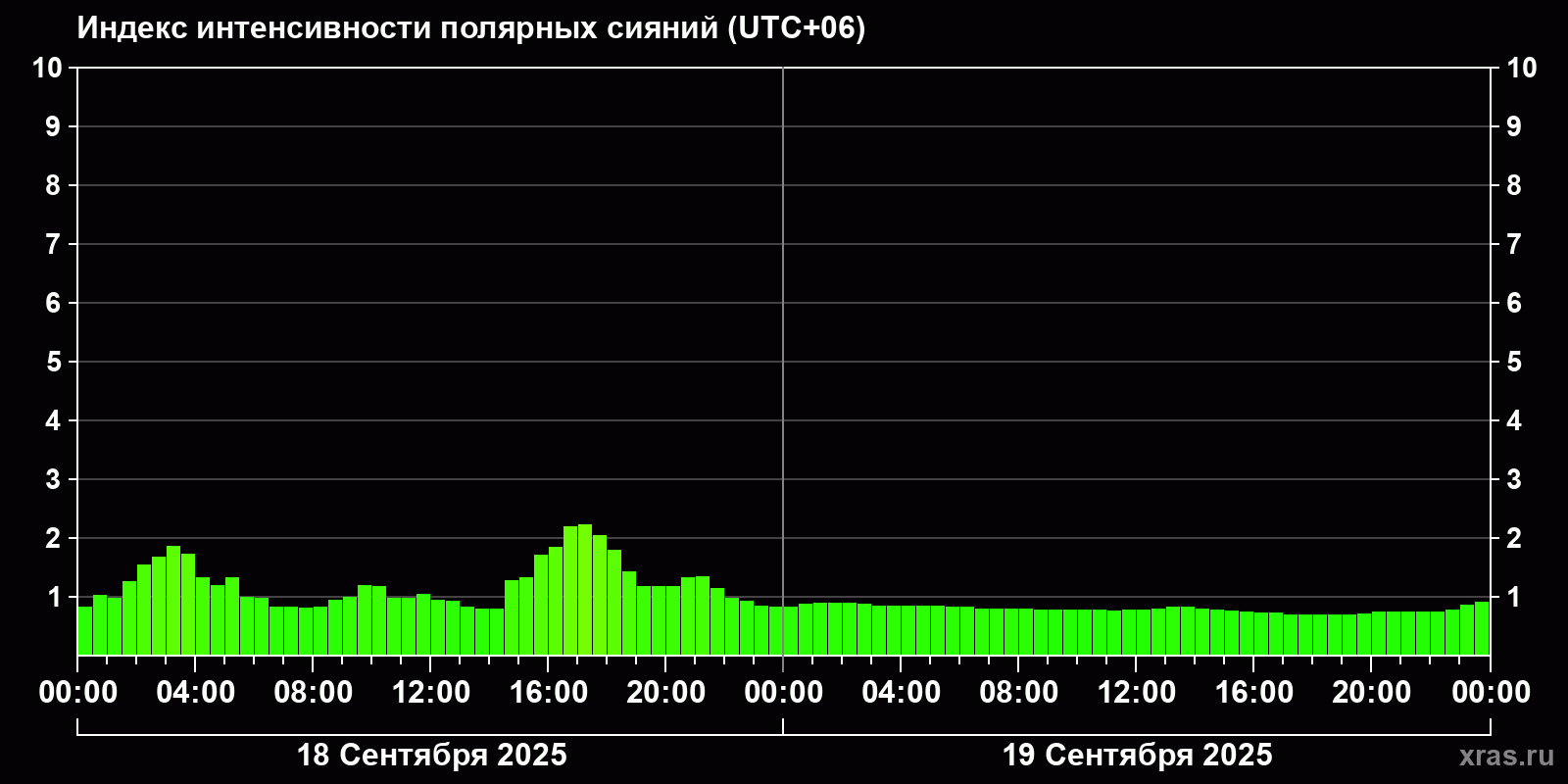Изменения индекса интенсивности полярных сияний с 2025-09-18 по 2025-09-19 по местному времени