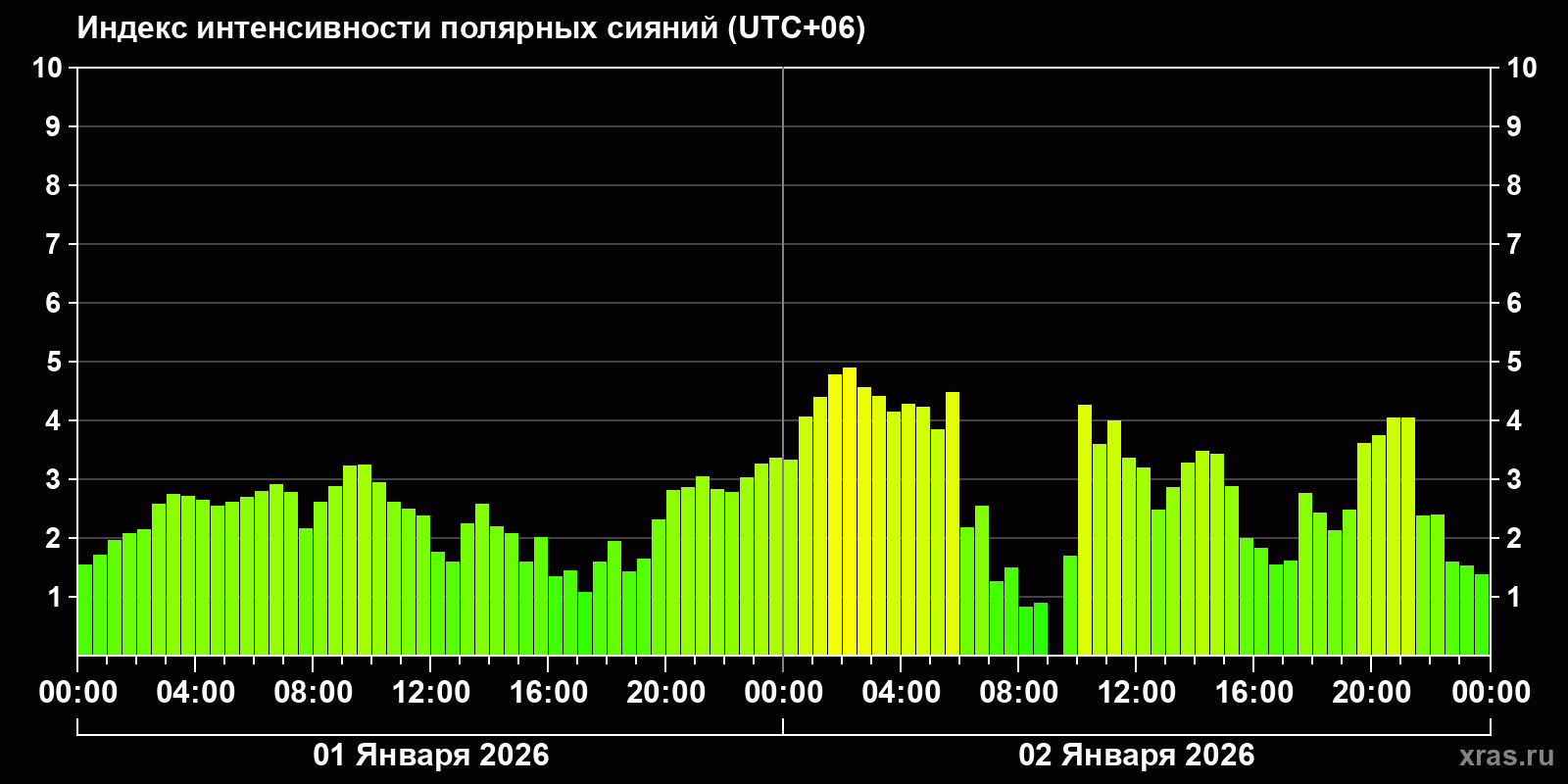 Изменения индекса интенсивности полярных сияний с 2026-01-01 по 2026-01-02 по местному времени