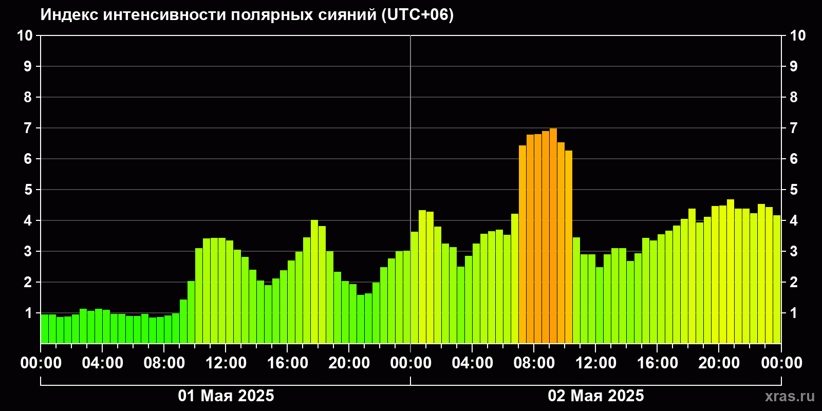 Изменения индекса интенсивности полярных сияний с 2025-05-01 по 2025-05-02 по местному времени