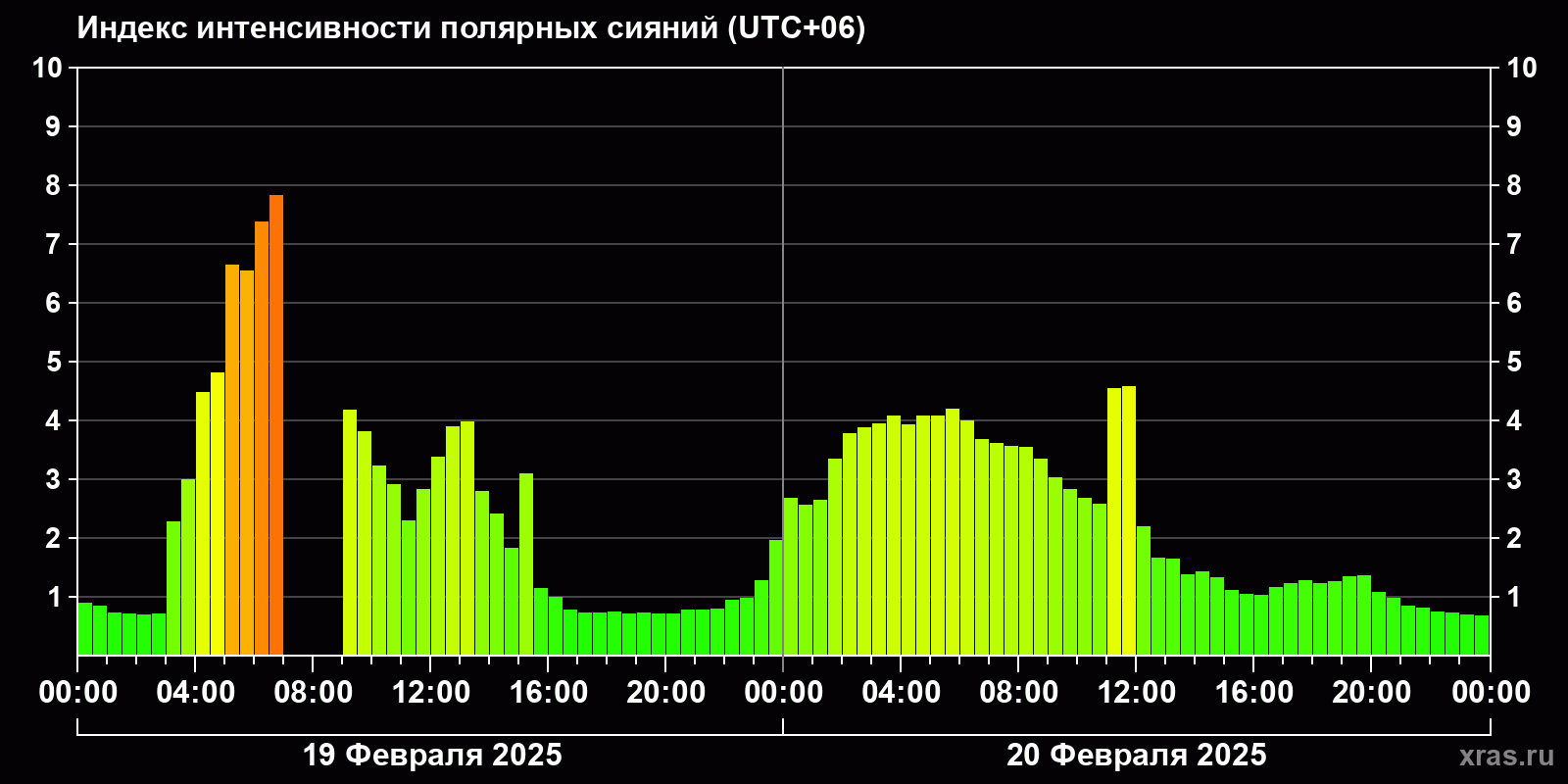 Изменения индекса интенсивности полярных сияний с 2025-02-19 по 2025-02-20 по местному времени