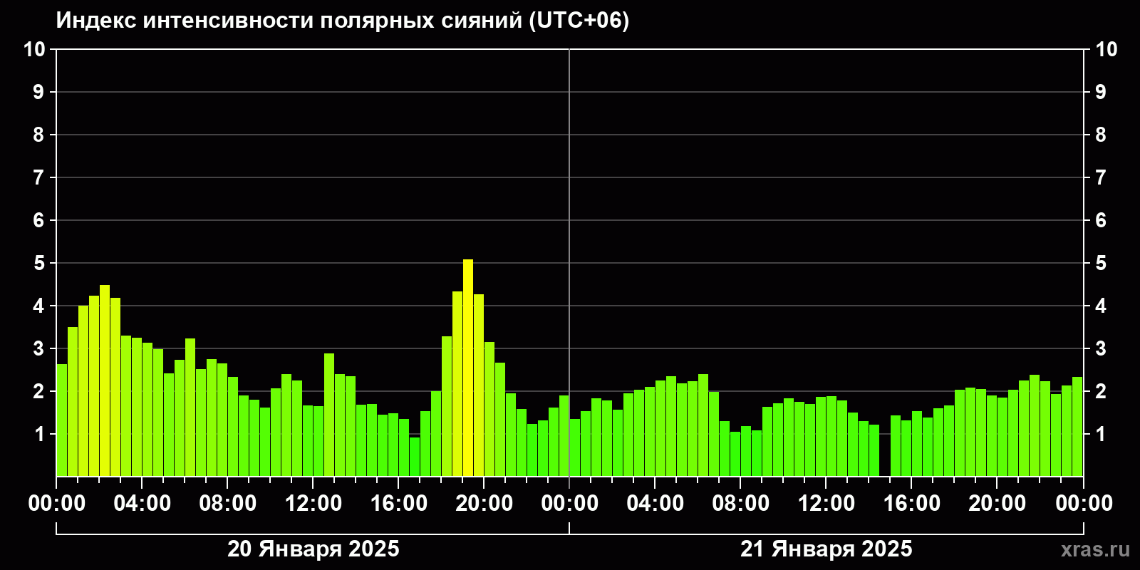 Изменения индекса интенсивности полярных сияний с 2025-01-20 по 2025-01-21 по местному времени