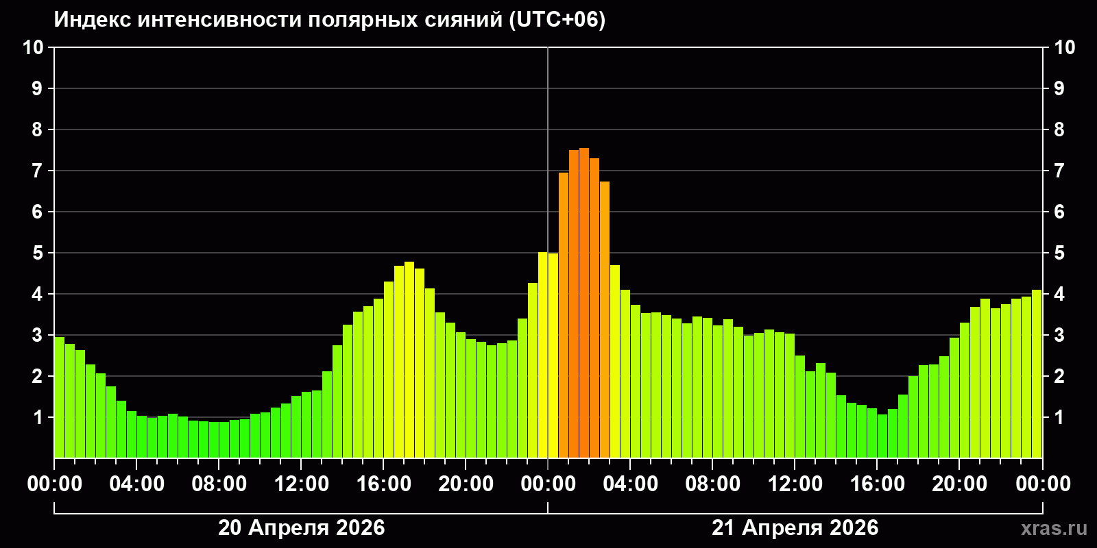 Изменения индекса интенсивности полярных сияний с 2026-04-20 по 2026-04-21 по местному времени