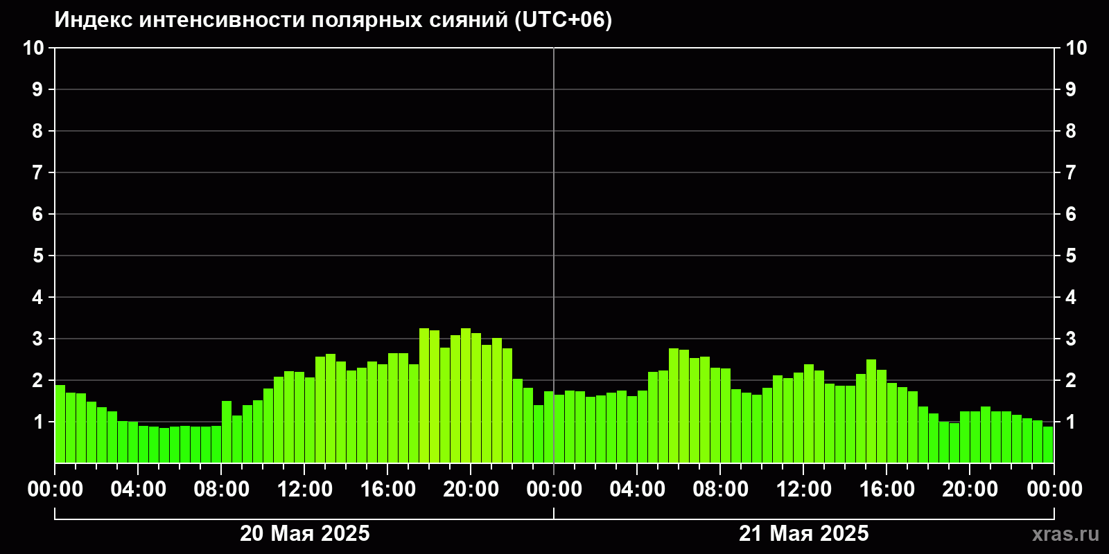 Изменения индекса интенсивности полярных сияний с 2025-05-20 по 2025-05-21 по местному времени
