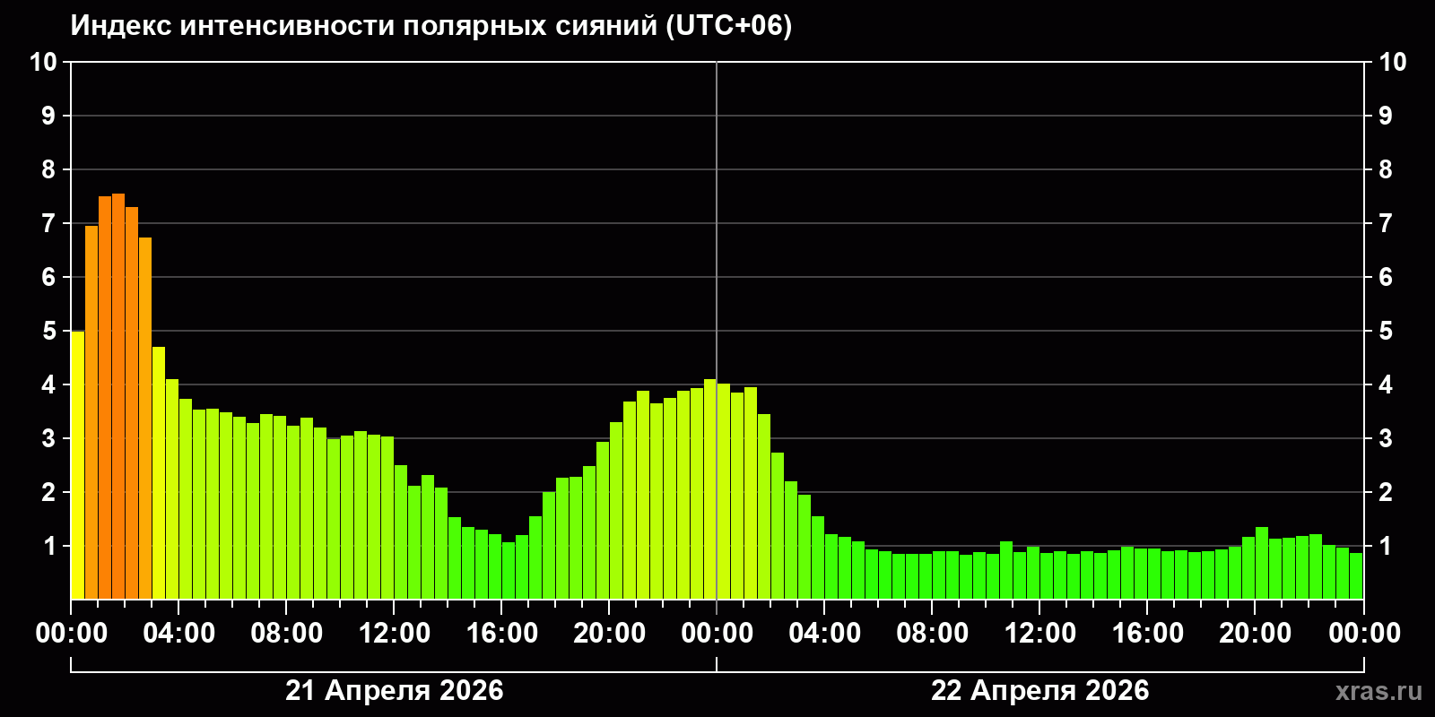 Изменения индекса интенсивности полярных сияний с 2026-04-21 по 2026-04-22 по местному времени
