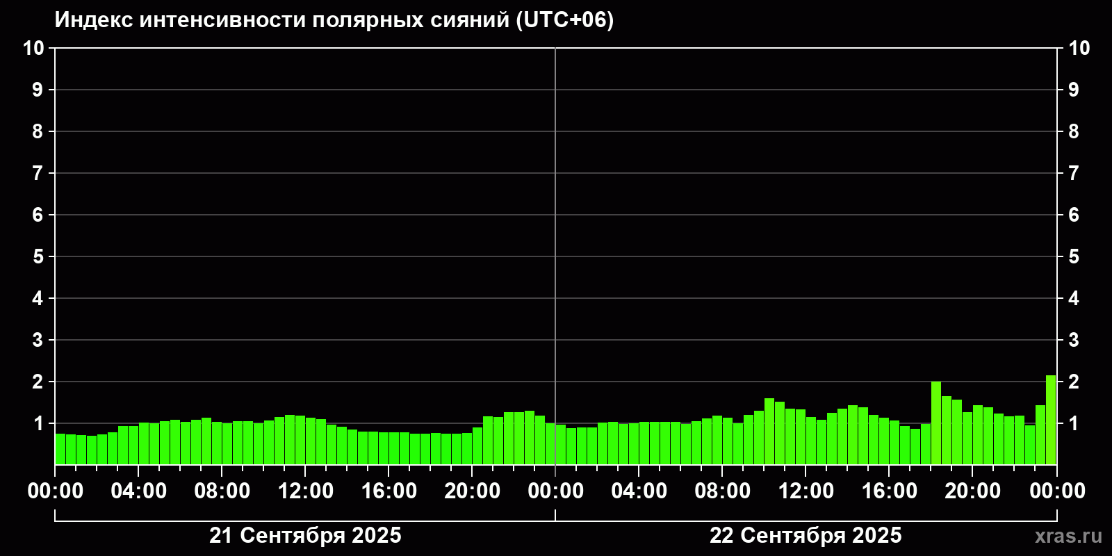 Изменения индекса интенсивности полярных сияний с 2025-09-21 по 2025-09-22 по местному времени