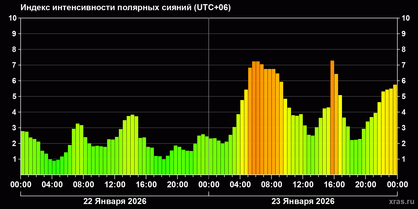 Изменения индекса интенсивности полярных сияний с 2026-01-22 по 2026-01-23 по местному времени