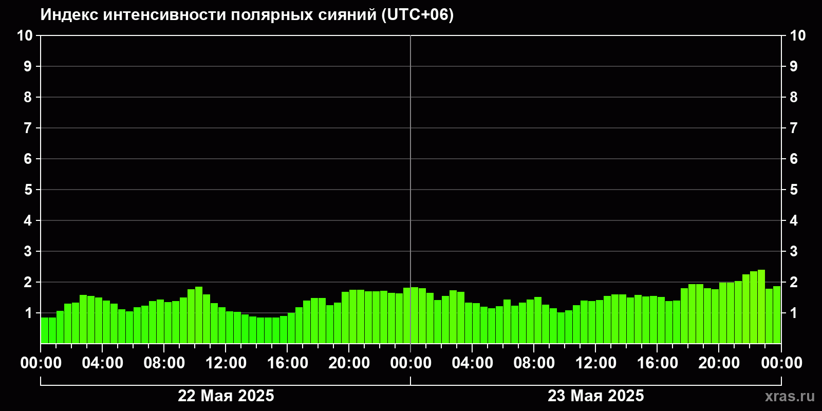 Изменения индекса интенсивности полярных сияний с 2025-05-22 по 2025-05-23 по местному времени