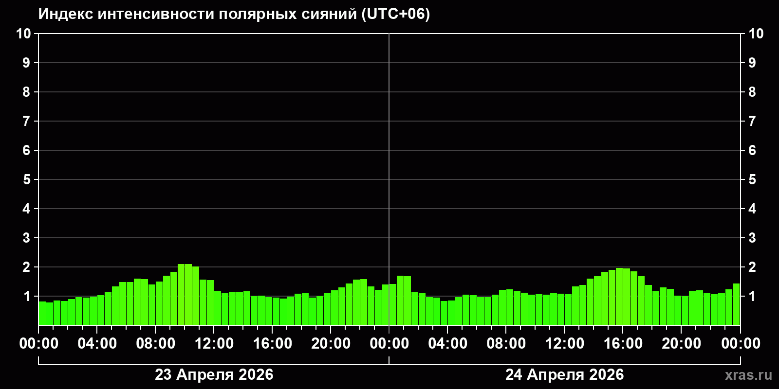 Изменения индекса интенсивности полярных сияний с 2026-04-23 по 2026-04-24 по местному времени