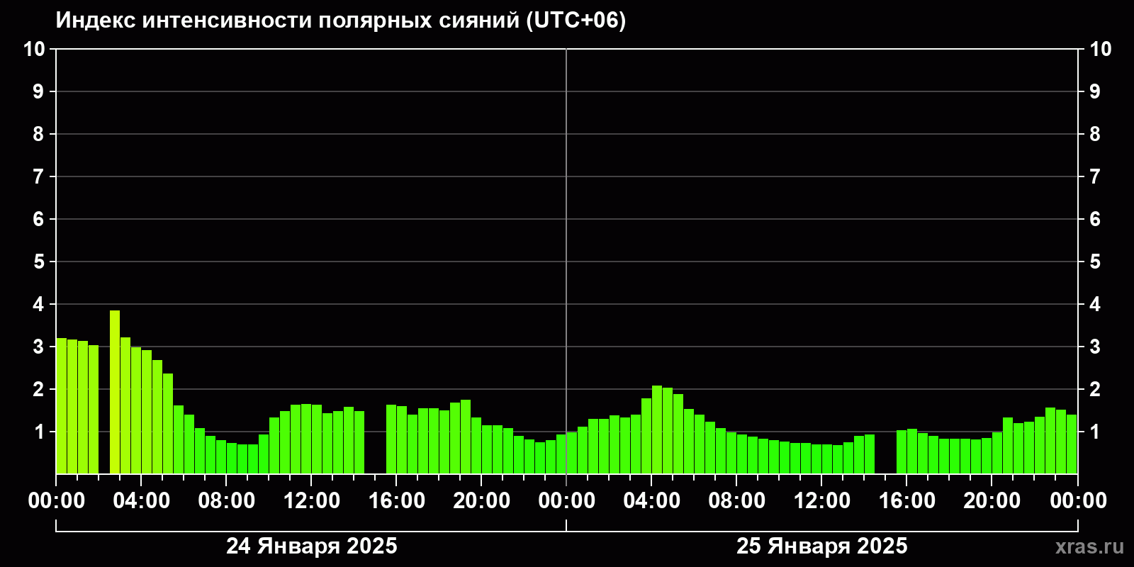 Изменения индекса интенсивности полярных сияний с 2025-01-24 по 2025-01-25 по местному времени