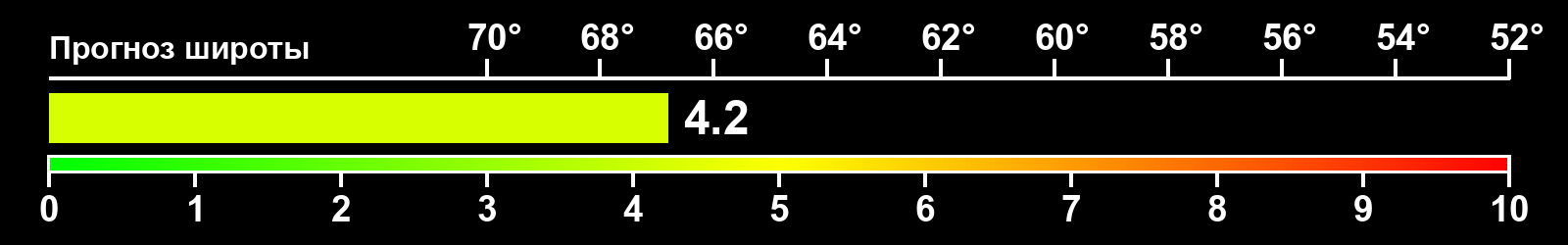 Индекс интенсивности полярных сияний и теоретически возможная широта наблюдений для ночного времени в восточном полушарии по состоянию на 2025-11-25 23:51 (конец дня) по местному времени