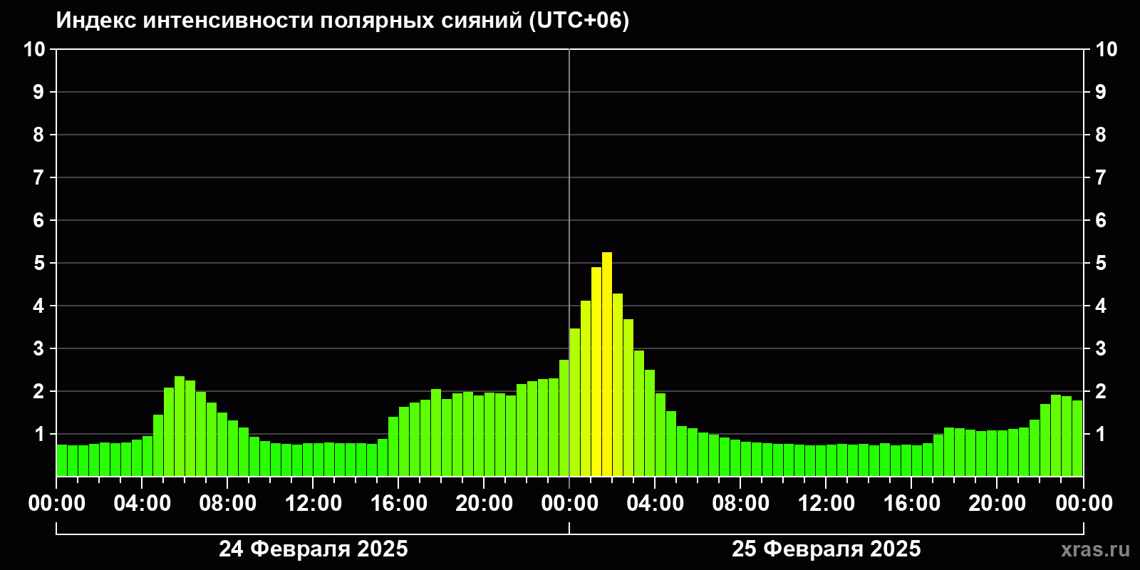 Изменения индекса интенсивности полярных сияний с 2025-02-24 по 2025-02-25 по местному времени