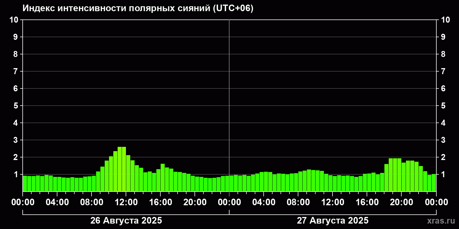 Изменения индекса интенсивности полярных сияний с 2025-08-26 по 2025-08-27 по местному времени