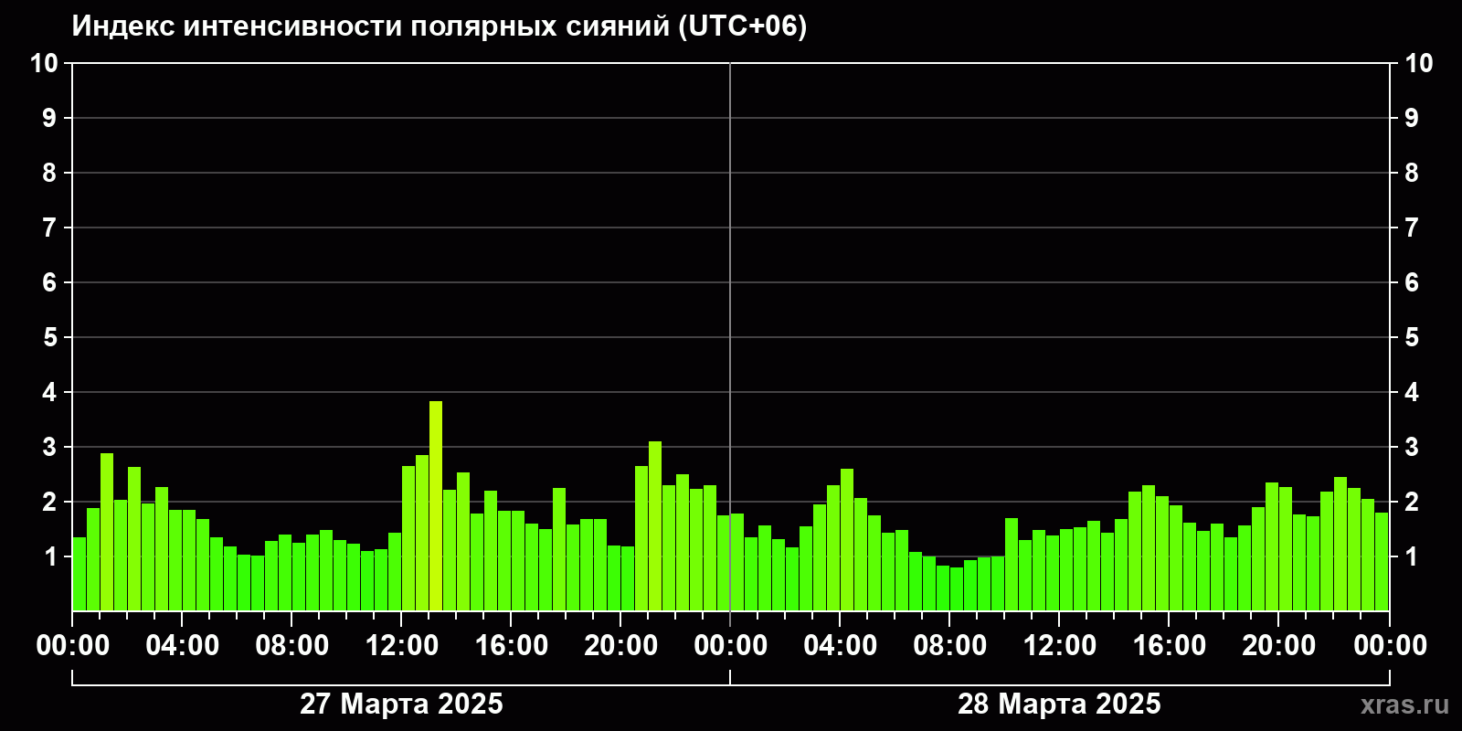 Изменения индекса интенсивности полярных сияний с 2025-03-27 по 2025-03-28 по местному времени