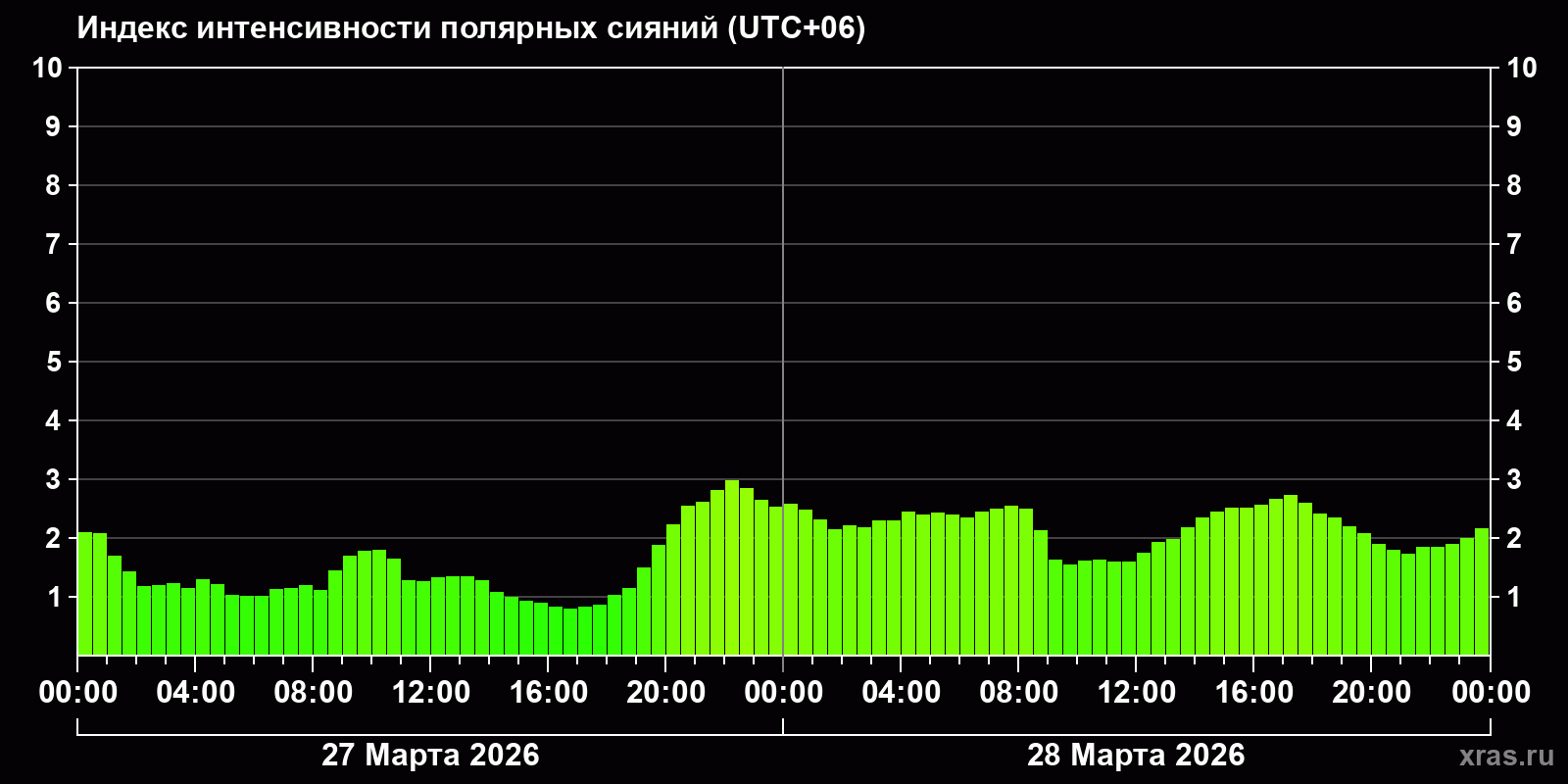 Изменения индекса интенсивности полярных сияний с 2026-03-27 по 2026-03-28 по местному времени