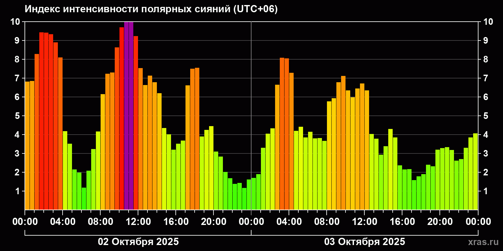 Изменения индекса интенсивности полярных сияний с 2025-10-02 по 2025-10-03 по местному времени