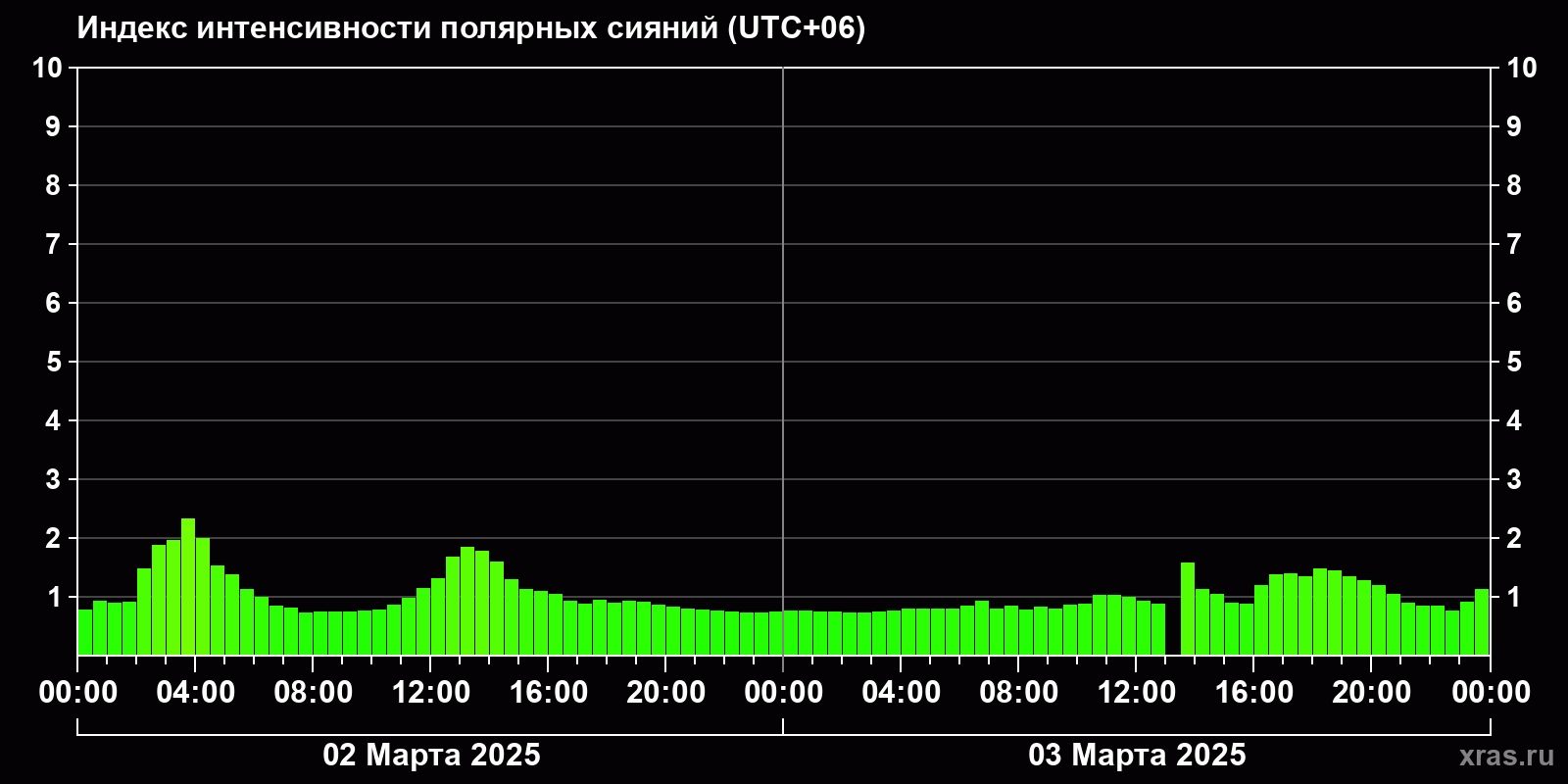 Изменения индекса интенсивности полярных сияний с 2025-03-02 по 2025-03-03 по местному времени