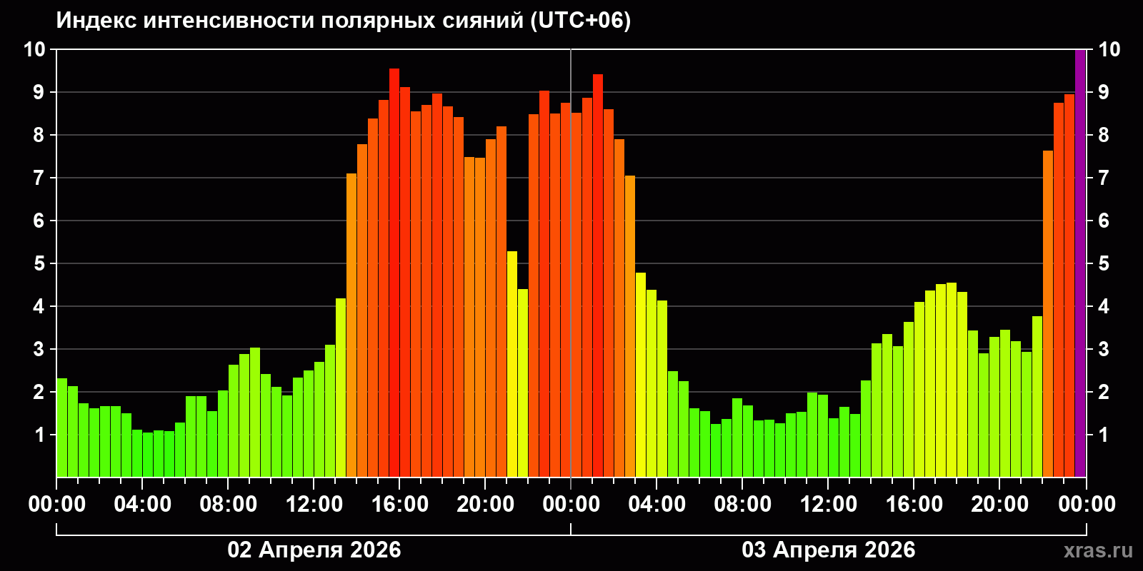 Изменения индекса интенсивности полярных сияний с 2026-04-02 по 2026-04-03 по местному времени