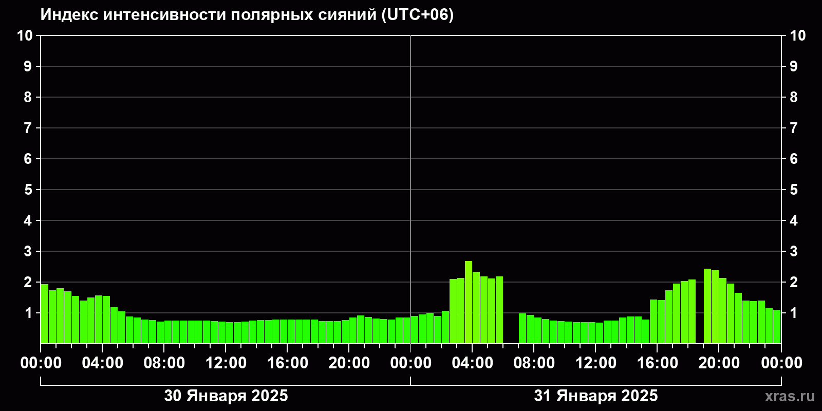 Изменения индекса интенсивности полярных сияний с 2025-01-30 по 2025-01-31 по местному времени