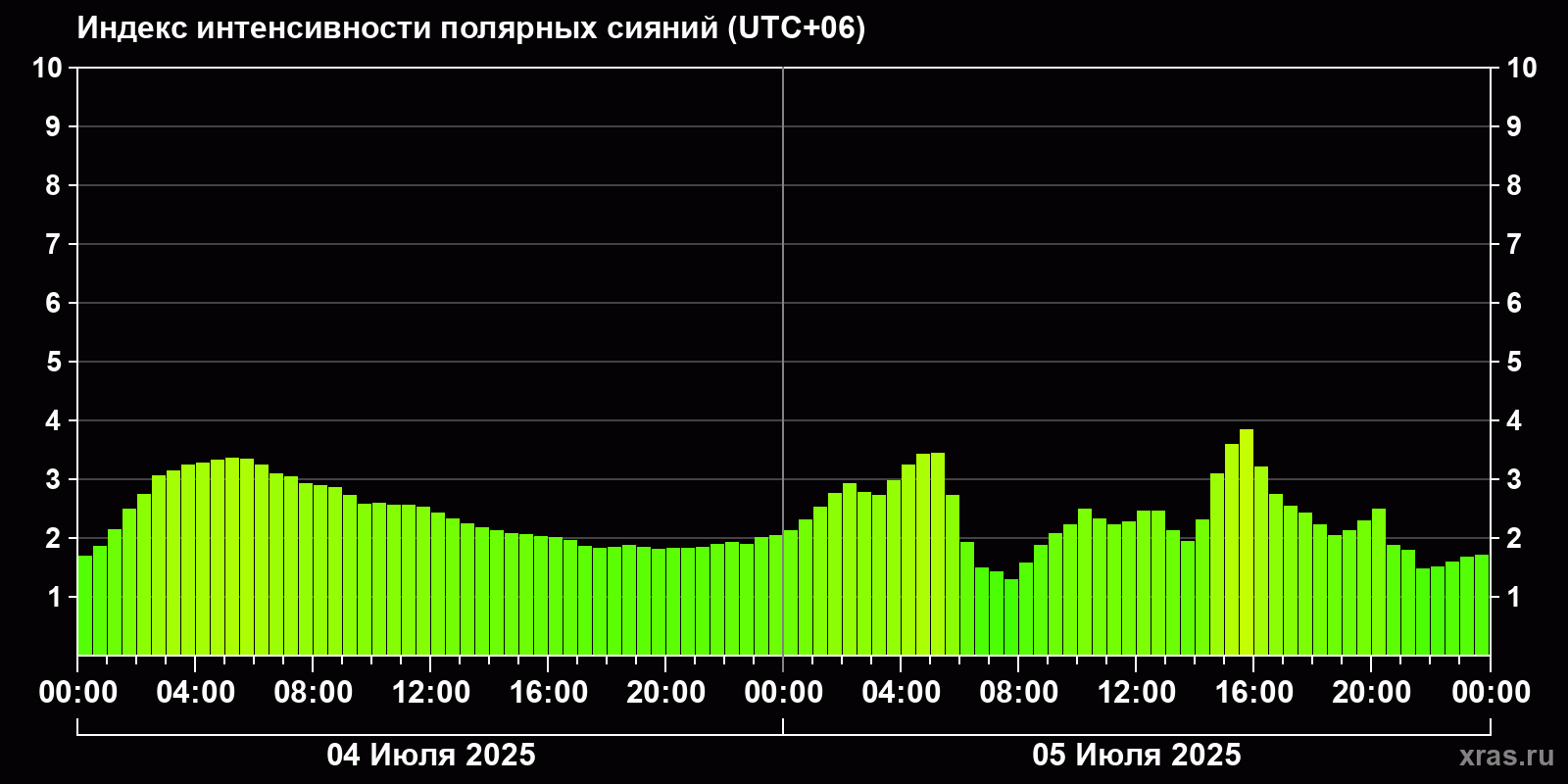 Изменения индекса интенсивности полярных сияний с 2025-07-04 по 2025-07-05 по местному времени